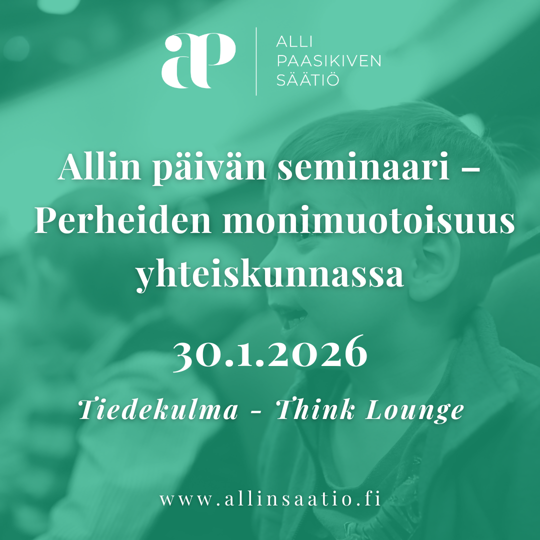 Allin päivän perhepoliittisen seminaarin teema vuonna 2026 on perheiden monimuotoisuus yhteiskunnassa. Seminaari on avoin keskustelutilaisuus sekä katsaus perhepolitiikan nykytilaan Suomessa. Tilaisuus järjestetään Tiedekulman Think Loungessa 30.1.2026 klo 9.00-11:15, tervetuloa mukaan!